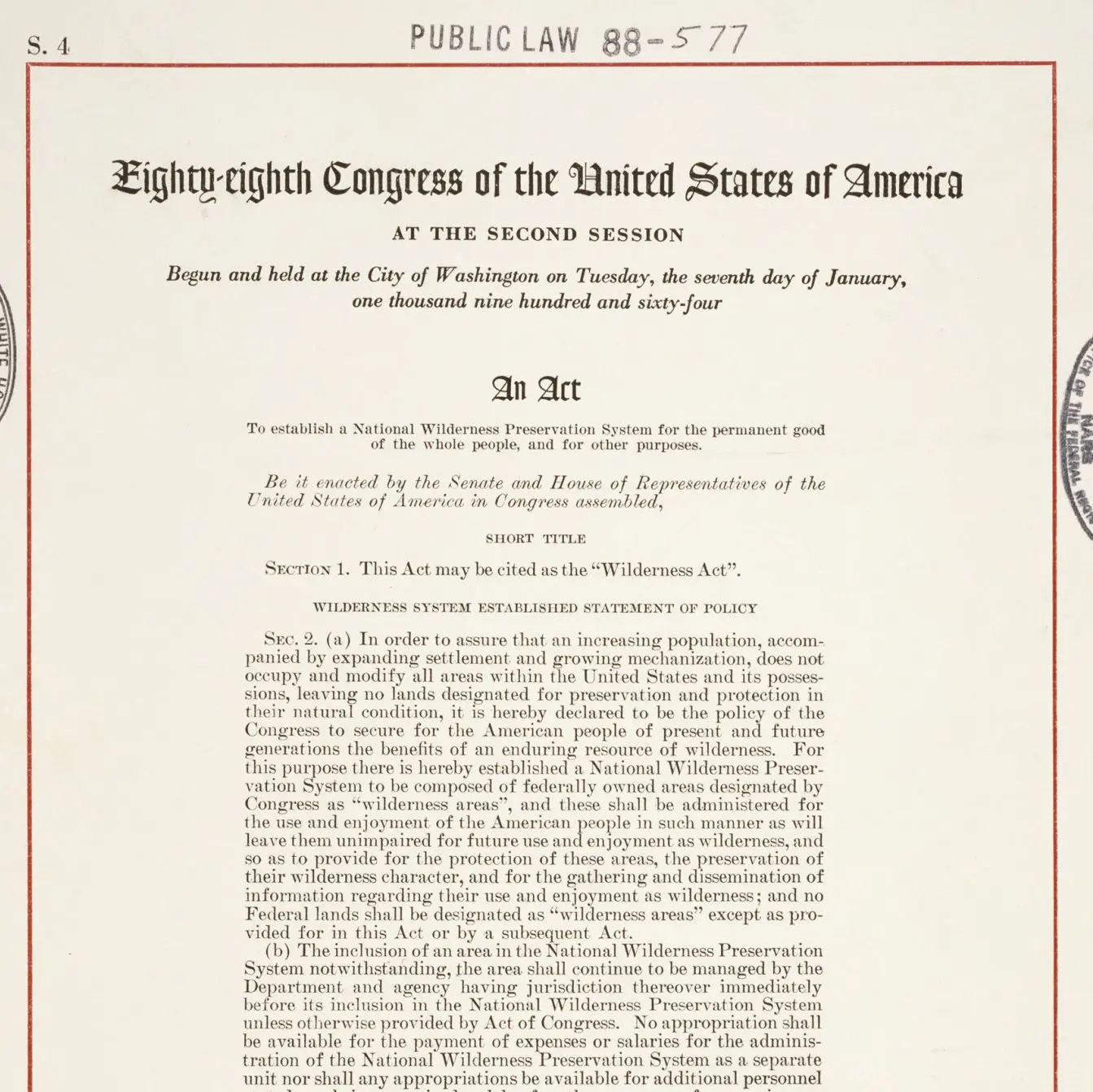 Also known as the Wilderness Act, this 1964 law provides for a National Wilderness Preservation System to ensure that wilderness lands will be protected in their natural condition. The System is composed of Federally owned land designated by Congress as “wilderness areas.” The Act defines “wilderness” and gives responsibility for maintaining the areas to the Federal agencies that have jurisdiction over them.
