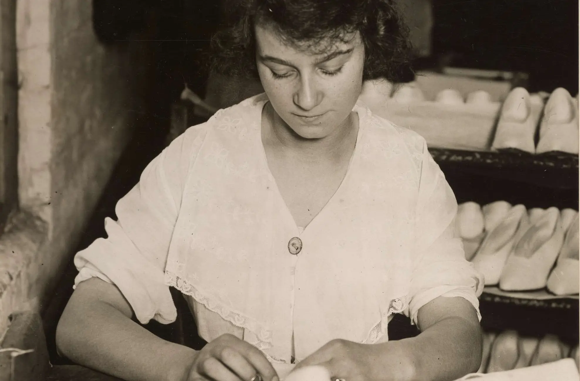 The original caption for this photograph reads: Women Workers in Shoe Factory. Women have replaced men in shoe manufacturing plants and are operating many of the heavy machines. Women workers are shown sewing on bows. They are making fabric shoes which the women of the country are wearing so that leather can be utilized for the shoes of the men in service. Taken in factory of J. & T. Cousins Co., Brooklyn, New York.