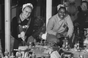 The original caption for this photograph reads: Women shipfitters worked on board the USS Nereus, and are shown as they neared completion of the floor in a part of the engine room. Left to right are Shipfitters Betty Pierce, Lola Thomas, Margaret Houston, Thelma Mort, and Katie Stanfill. US Navy Yard, Mare Island, CA.