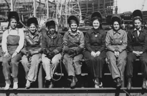 The caption for this photo reads: Line up of some of women welders including the women’s welding champion of Ingalls [Shipbuilding Corp., Pascagoula, MS].