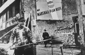 The original caption for this photograph reads: Marshall Plan aid to Germany totaled $1,390,600 and enabled that country to rise from the ashes of defeat, as symbolized by this worker in West Berlin. Even a year before the end of the Marshall Plan in 1951, Germany had surpassed her prewar industrial production level.