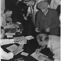 On August 14, 1935, the Social Security Act established a system of old-age benefits for workers, benefits for victims of industrial accidents, unemployment insurance, aid for dependent mothers and children, the blind, and the physically handicapped. This image shows unemployed insured workers registering for jobs and filing benefit claims at a State employment office.