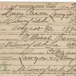 The draft registration card of Huey Pierce Long indicates that he worked as a notary public. The Selective Service Act of May 18, 1917, authorized the President to temporarily increase the U.S. military. Under the authority of this act and later acts, the Army’s Office of the Provost Marshall General supervised the registrations of approximately 24 million men for the World War I draft. Three registrations were held: the first, on June 5, 1917, for men aged 21 through 30; the second, on June 5, 1918, for men who had become 21 since June 5, 1917, supplemented by a registration held August 24, 1918, for men who had become 21 since June 2, 1918; and, the third, on September 12, 1918, for all men aged 18 through 45 who had not previously registered. The existence of a draft card does not necessarily denote military service. Registration is often confused with induction into the military; however, only a small percentage of those who registered were actually inducted into the military. The reverse is also true. All men who served in World War I did not necessarily register for the draft. Those who volunteered or those who were already in the military did not register.