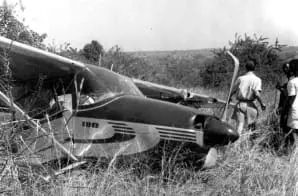 This photograph shows the wreckage of the small Cessna 180 plane that carried Ernest and Mary Hemingway while on his second African safari. The crash occurred near Murchison Falls, Uganda. The three men at right are unidentified.