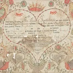 Pvt. Jacob Shoemaker of Pennsylvania served in Col. Henry Haller’s Battalion of the Flying Camp. He was in the Battle of Long Island, New York, and was discharged in March 1777. His children submitted this illustrated family record (Fraktur) in German in support of their claim for a pension based on his service. The claim was approved in October 1852, and the children received $257.05.