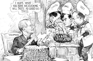 President Truman had recently announced a plan developed by the American Federation of Labor and construction contractors to arbitrate pay and other disputes with the aim of avoiding strikes. Cartoonist Clifford Berryman shows a pleased Truman taking a bite of the new building trades agreement cake while commenting to the cooks creating the new labor legislation that he hoped the new cooking would taste as good as the agreement cake. The three cooks are Senators Robert A. Taft, Jr. of Ohio, Joseph H. Ball of Minnesota and Smith.