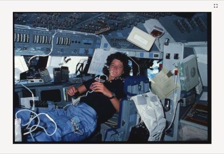 You may wish to draw students’ attention to the details on Sally Ride’s uniform, the various floating objects, and the space shuttle instruments.