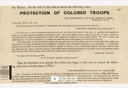 In this activity students will analyze a two-page poster that the Government used to recruit recently freed slaves to fight for the Union Army during the Civil War. The poster refers to the Emancipation Proclamation and to President Lincoln’s General Order 233 to provide equal pay for black soldiers and equal protection if they were captured by the Confederacy and became prisoners of war (POWs). They will learn how the U.S. Government tried to appeal to black soldiers and consider the importance of enlisting black soldiers to the Union’s victory.