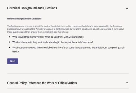 Direct students to begin the online activity. They will analyze and answer questions about four memos exchanged by AEF General Headquarters (Intelligence, Censorship and Press division), General John J. Pershing (who led the American Expeditionary Forces), and the artists between August and September 1918.