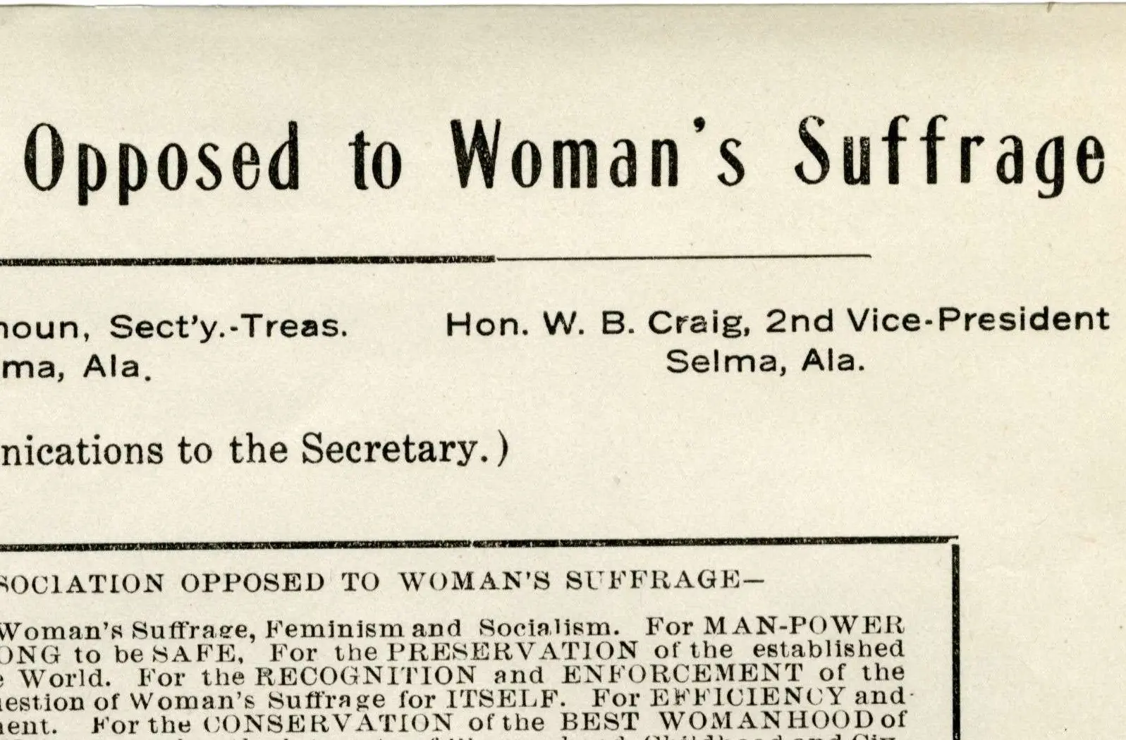 Martin L. Calhoun, of the Alabama Male Association Opposed to Woman’s Suffrage, sent this letter to Senator Duncan U. Fletcher opposing the proposed Susan B. Anthony Suffrage Amendment (the 19th Amendment). He wrote that each state should “be permitted to solve the issue for itself,” and asks “in all seriousness – what will become of white supremacy in the grand old South?”