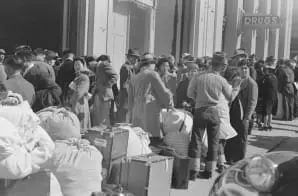 The original caption for this photograph, taken by photographer Dorothea Lange, reads: San Francisco, California. With baggage stacked, residents of Japanese ancestry await bus at Wartime Civil Control Administration station, 2020 Van Ness Avenue, as part of the first group of 664 to be evacuated from San Francisco on April 6, 1942. Evacuees will be housed in War Relocation Authority centers for the duration.
