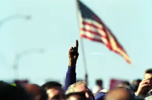 This photograph shows participants and an American flag at a civil rights event in Selma, Alabama, in 2000. They were commemorating “Bloody Sunday,” which happened on March 7, 1965. During Bloody Sunday, a peaceful protest in Selma turned violent after civil rights protesters were suppressed by state troopers using violence and tear gas. After many Americans saw the events broadcast on TV, there was great support for Federal voting rights legislation to guarantee the right to vote regardless of race.