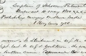 The crew of the Patuxent was arrested for participating in the illegal slave trade, in violation of the Slave Trade Act of 1800. In this deposition, William Chandler of the U.S.S. Yorktown stated his belief the ship was rigged and carried extra supplies used to transport slaves. It comes from the case United States v. Nathaniel T. Davis.
