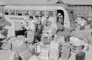 The original caption for this photograph, taken by War Relocation Authority photographer Francis Stewart, reads: Eden, Idaho. Baggage, belonging to evacuees from the assembly center at Puyallup, Washington, is sorted and trucked to owners in their barrack apartments.