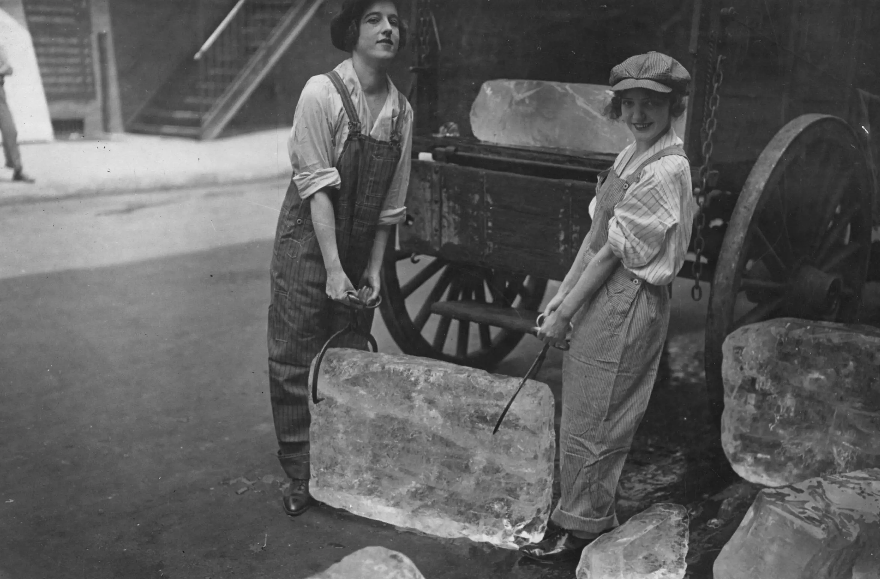 The original caption for this photograph reads: Girls deliver ice. Heavy work that formerly belonged to men only is being done by girls. The ice girls are delivering ice on a route and their work requires brawn as well as the patriotic ambition to help.