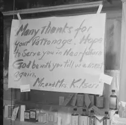 The original caption for this photograph reads: Los Angeles, California. Mr. and Mrs. K. Iseri have closed their drugstore in preparation for the forthcoming evacuation from their “Little Tokyo” in Los Angeles.