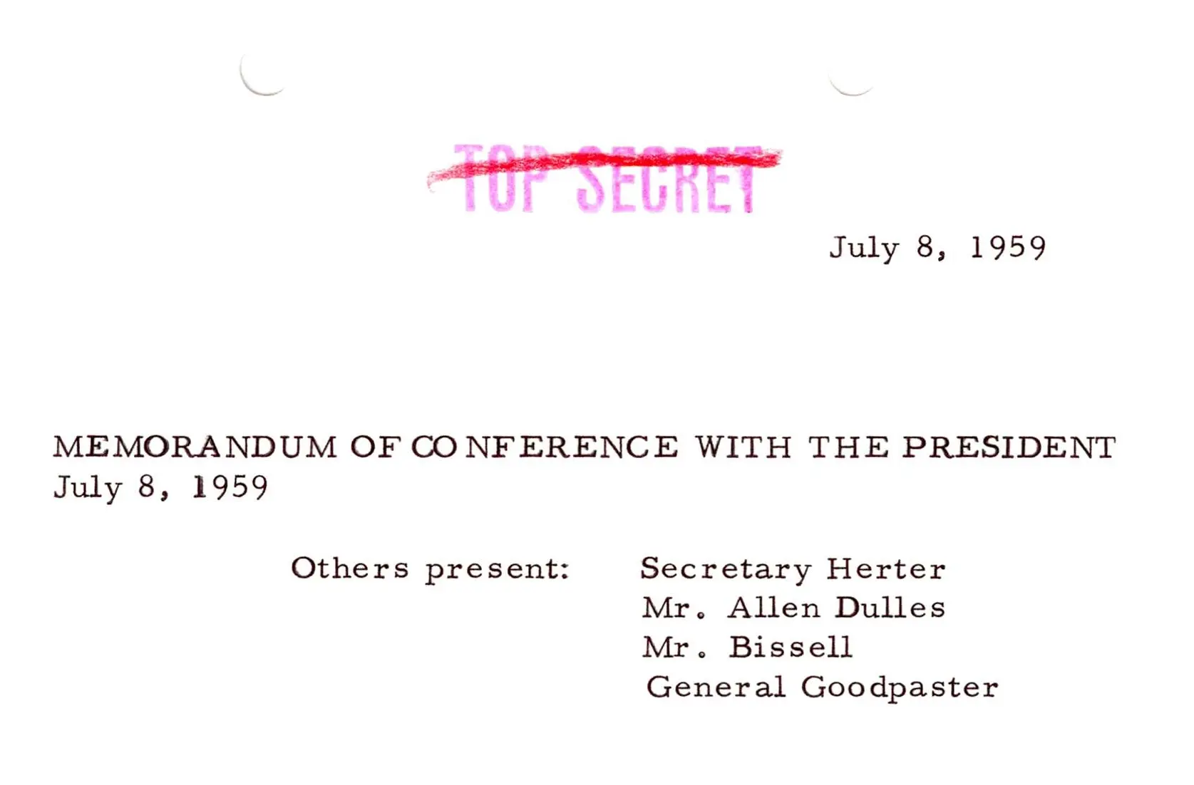 Full Citation: Memorandum of Conference with the President Authored by Andrew J. Goodpaster; 7/8/1959; Intelligence Matters (12); Alphabetical Subjects, 1953 – 1961; Collection DDE-WHOSS: White House Office, Office of the Staff Secretary: Records of Paul T. Carroll, Andrew J. Goodpaster, L. Arthur Minnich, and Christopher H. Russell,; Dwight D. Eisenhower Library, Abilene, KS. [Online Version, https://docsteach.org/document/memo-eisenhower-goodpaster/, January 7, 2026]