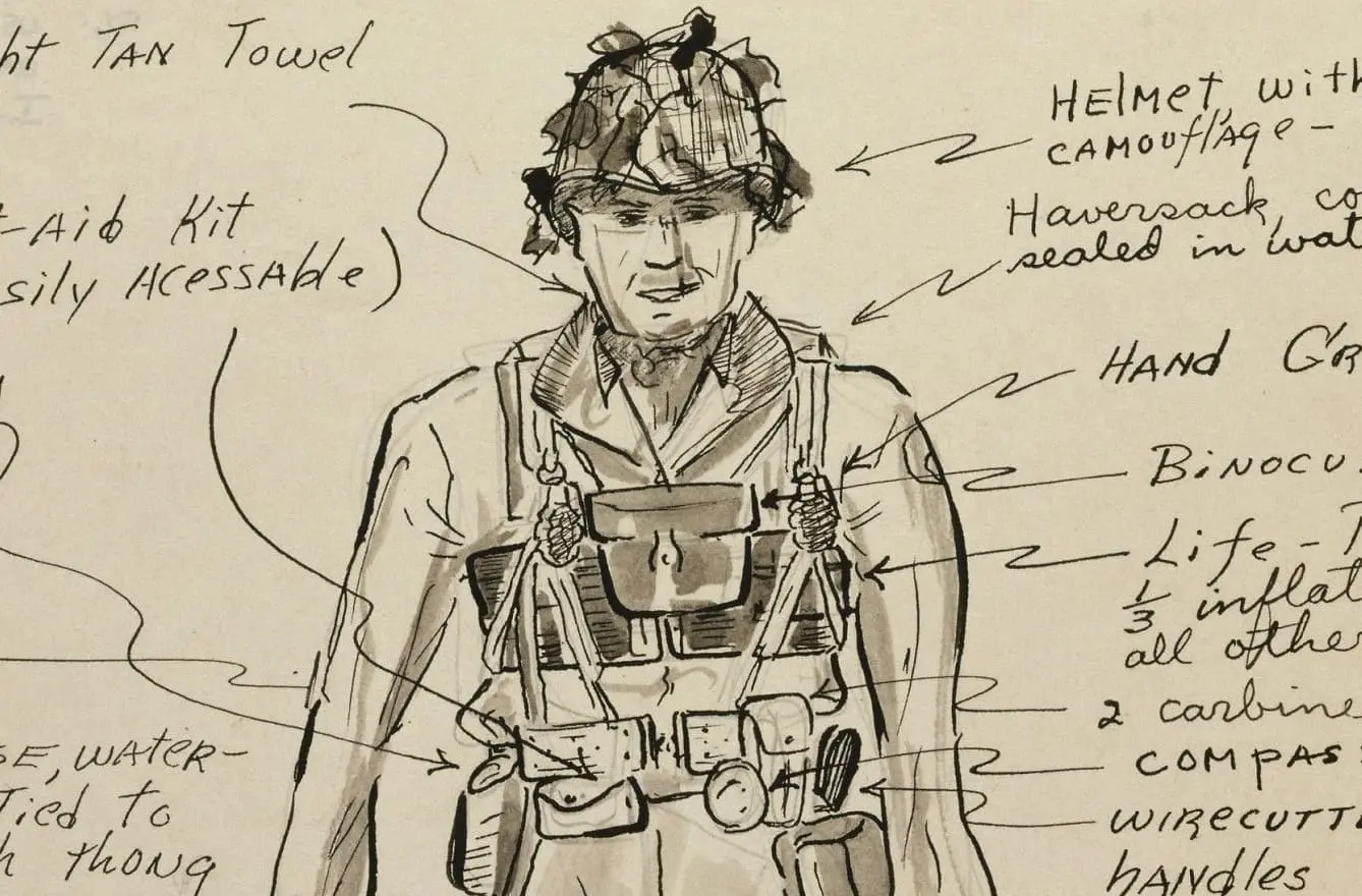 The D-day assault was rigorous and required soldiers to be prepared for an attack that started at sea and ended on land. This drawing by combat historian Lt. Jack Shea, who was attached to the 29th Infantry Division, illustrates that soldiers were well equipped for an amphibious attack. Several features were designed to help soldiers survive in water.