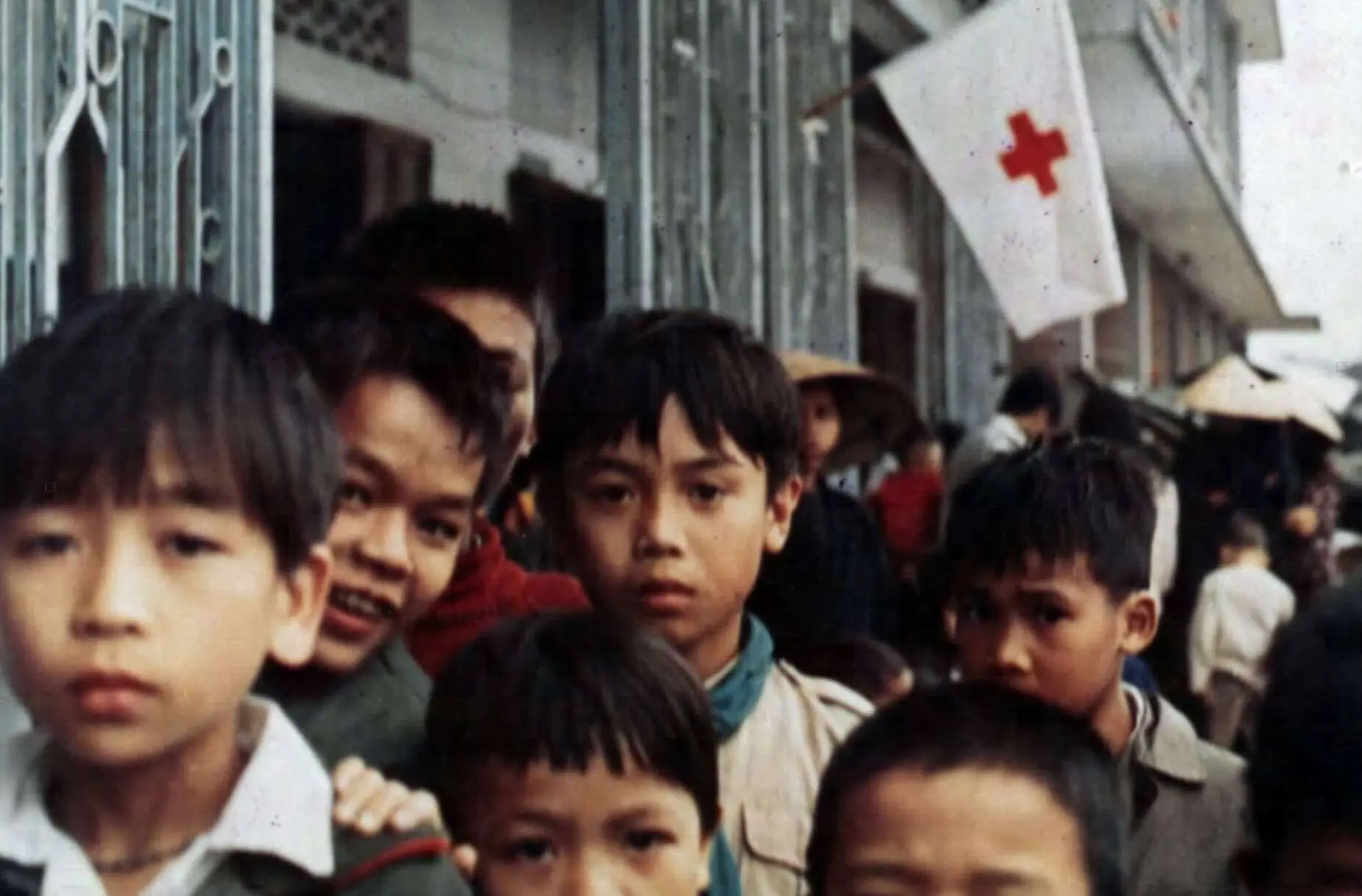 Full Citation: Photograph 111-CC-81726; Vietnamese Children Outside the Viet Huong Refugee Center; 4/1972; Color Photographs of Signal Corps Activity, 1944 – 1981; Records of the Office of the Chief Signal Officer, Record Group 111; National Archives at College Park, College Park, MD. [Online Version, https://docsteach.org/document/viet-huong-refugee-center/, January 30, 2026]
