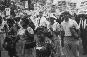 This photograph shows participants at the March on Washington for Jobs and Freedom on August 28, 1963. The event brought hundreds of thousands of marchers to the National Mall in Washington, DC, to support civil rights for African Americans.