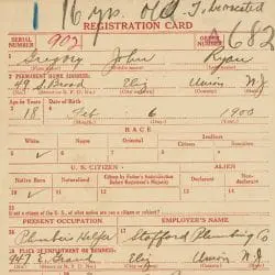 The draft registration card of Gregory Ryan indicates that he registered in Elizabeth City, New Jersey at age 16. The Selective Service Act of May 18, 1917, authorized the President to temporarily increase the U.S. military. Under the authority of this act and later acts, the Army’s Office of the Provost Marshall General supervised the registrations of approximately 24 million men for the World War I draft. Three registrations were held: the first, on June 5, 1917, for men aged 21 through 30; the second, on June 5, 1918, for men who had become 21 since June 5, 1917, supplemented by a registration held August 24, 1918, for men who had become 21 since June 2, 1918; and, the third, on September 12, 1918, for all men aged 18 through 45 who had not previously registered. The existence of a draft card does not necessarily denote military service. Registration is often confused with induction into the military; however, only a small percentage of those who registered were actually inducted into the military. The reverse is also true. All men who served in World War I did not necessarily register for the draft. Those who volunteered or those who were already in the military did not register.
